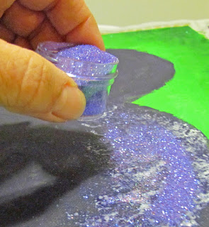 12) Working in sections around the outside of the image only, add another layer of paint immediately followed with a sprinkling of Green Briar Glitter. Be sure and add it ONLY to the outside of the canvas. You don't want to have to paint the heart over glitter.