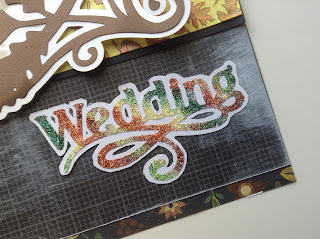 Clare flipped down the template and painted the word Autumn in Art Glitter. She carefully cleaned off excess glitter on the template, her hands and her work station and then flipped up the template to apply the white glitter. For the bottom portion of the title "Wedding", Clare cut the title using the Dreamweaver double sided mounting paper, a heavy duty blade, and the Cricut CTMH Artiste Cartridge. She used the dry paint brush technique for applying the different colors again. She then matted it on white paper and hand cut the offset white area.